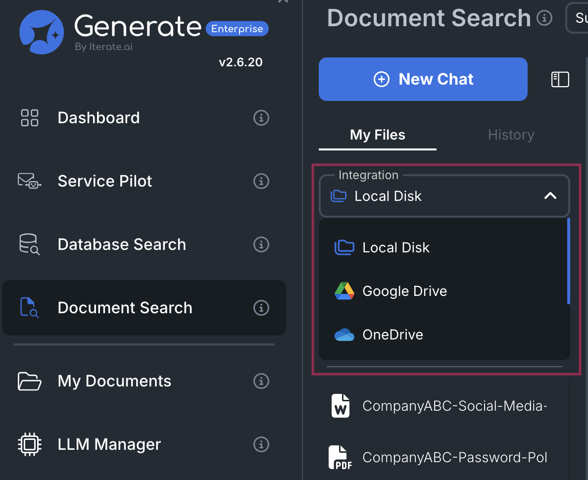 - Accessing Uploaded Documents - Your document will now appear in Document Search. If it does not appear immediately, try switching to another tab and back. To filter your documents by integration, use the Integration Dropdown Menu to select the storage location.